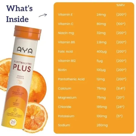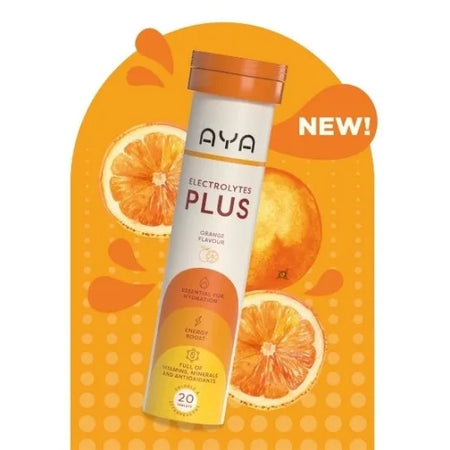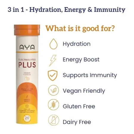 "Stay hydrated, energised, and supported with AYA Electrolytes Plus Orange. Each effervescent tablet delivers essential electrolytes and 13 key vitamins & minerals, including Vitamin C, B vitamins, and magnesium, to help reduce fatigue, support immunity, and keep your body balanced. Perfect for daily wellness, exercise, or travel, this vegan, gluten-free, and dairy-free formula dissolves quickly into a refreshing orange drink — making hydration simple and delicious. Hydration • Energy • Immunity Vegan | Gluten-Free | Dairy-Free