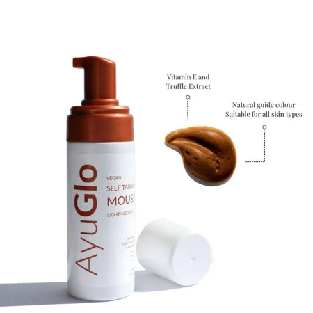 Indulge in a luxurious, streak-free tan with AYUGLO's Tanning Mousse MED DARK. This innovative formula provides an even, natural-looking tan that develops within hours, leaving your skin radiant and bronzed.