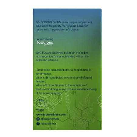 FabU Focus Brain is a daily food supplement formulated with 7 active ingredients, including Lion’s Mane mushroom, L-Tyrosine, Choline Bitartrate, and B vitamins. Designed to fit into your daily wellness routine, these vegetarian-friendly capsules are easy to take anytime.