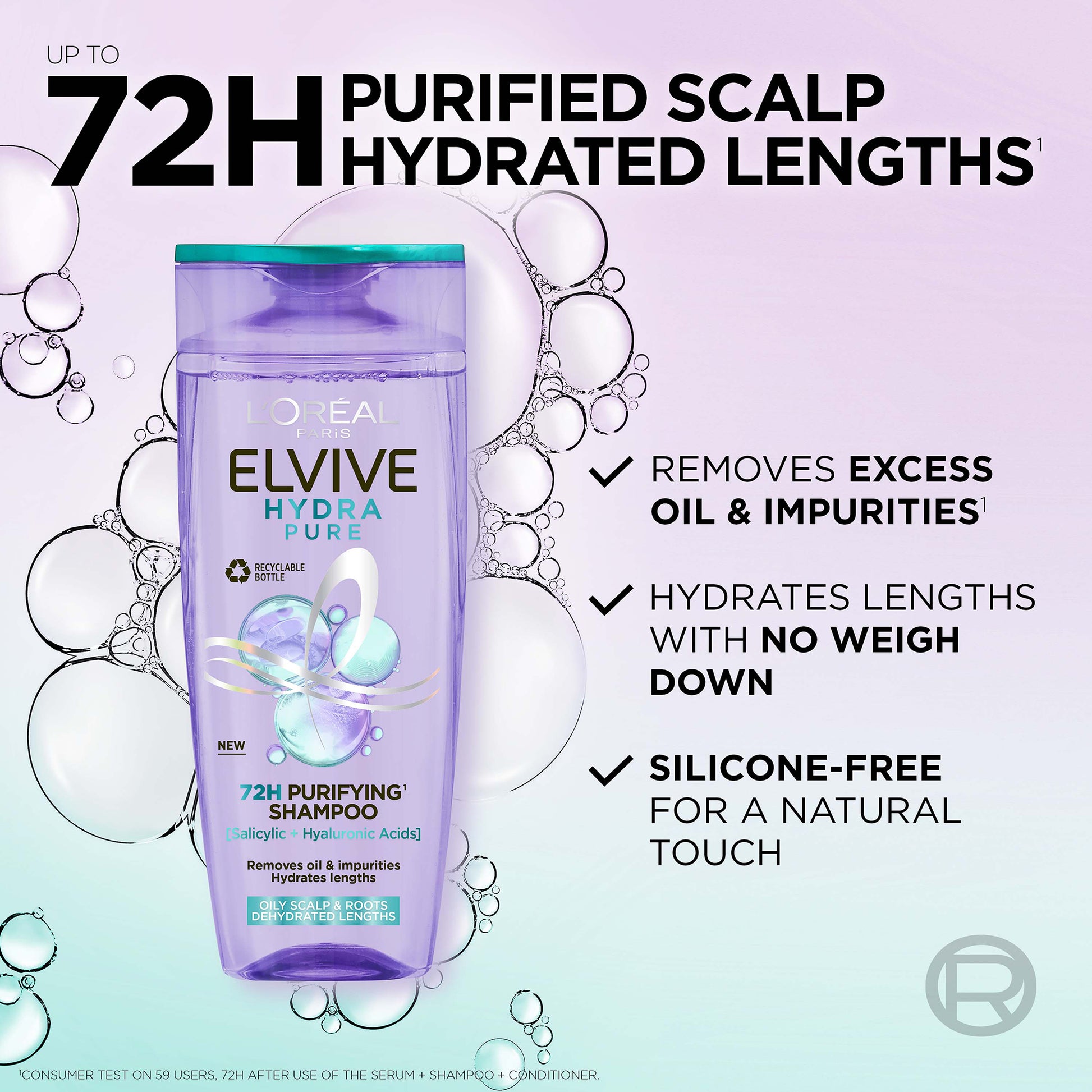 Washed your hair yesterday and roots already greasy? Discover Elvive Hydra Pure 72h Purifying Shampoo by L’Oréal Paris! Inspired by skincare, our formula is powered with [Salicylic Acid], which helps remove excess oil and impurities & [Hyaluronic Acid] for a boost of moisture. The result? Get up to 72h of a purified scalp & hydrated lengths* without stripping natural moisture and no weigh down. Our formula is suitable for all hair types & textures and silicone-free for a natural touch. *Consumer test on 59 users, up to 72h after use of the serum + shampoo + conditioner.