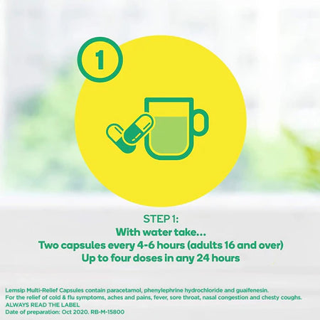 Each capsule contains 500mg of paracetamol, phenylephrine as a decongestant, and guaifenesin for a chesty cough.