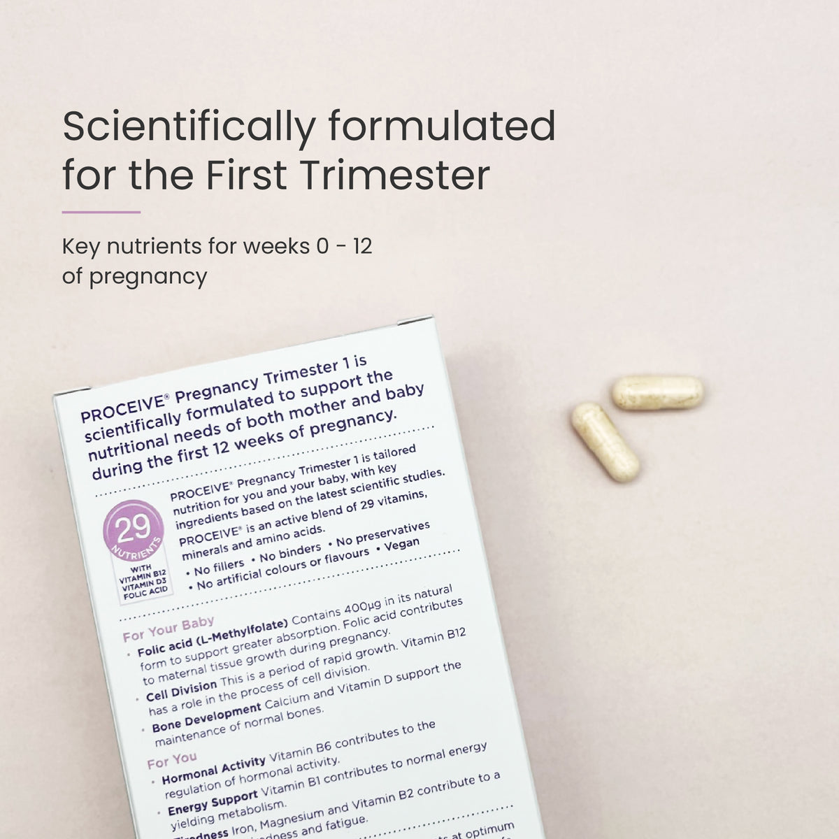 Proceive Pregnancy T1 is a daily nutritional supplement designed for women preparing for pregnancy and during the first trimester. This carefully developed formula includes a blend of vitamins, minerals, amino acids, and other nutrients that support daily wellness as part of a healthy lifestyle.