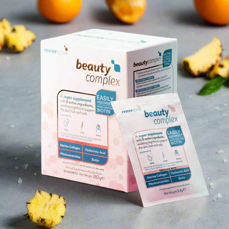 Beauty Complex is a daily powdered supplement made with carefully selected ingredients, including marine collagen, hyaluronic acid, phytoceramides, and biotin. This easy-to-mix sachet blends into water with a refreshing orange and pineapple flavour.