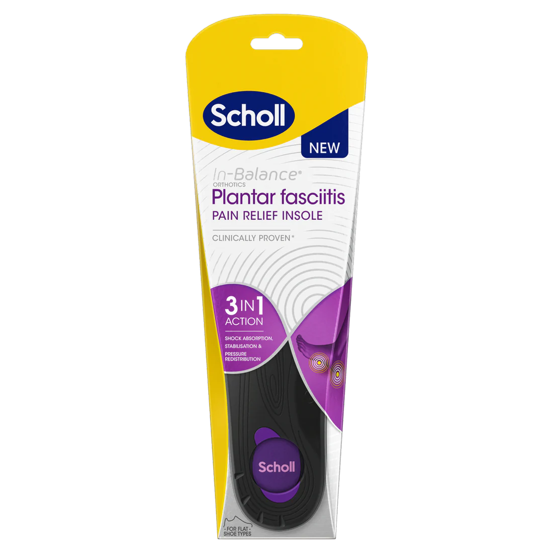 Scholl In-Balance® Orthotics Plantar Fasciitis Pain Relief Insoles are clinically proven to provide pressure relief to the base of the foot to help alleviate pain in the foot between the heel and the arch, known as plantar fasciitis. The insole has been specifically designed by biomechanics experts to provide a 3-in-1 action to help elevate the pain associated with plantar fasciitis.