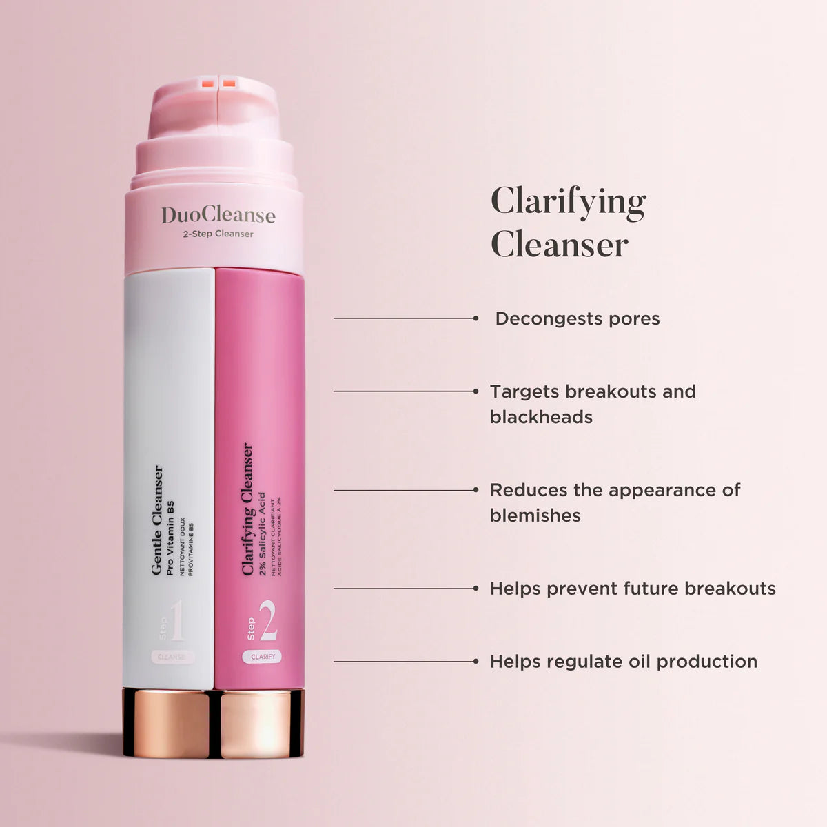Cleanse & Clarify is a 2-step cleansing system that cleanses the skin with Gentle Cleanser and then targets blemishes and congestion with Clarifying Cleanser. The system works effectively to remove congestion within the pores and to calm existing spots while preventing future breakouts