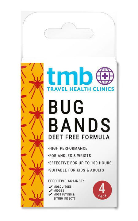 Stay bite-free with TMB Bug Bands 4pk, a DEET-free insect repellent solution from The Medical Bureau (TMB), Ireland’s trusted travel health experts. Designed for wrists or ankles, these lightweight, adjustable bands use micro-encapsulated Saltidin (icaridin) to repel mosquitoes, ticks, and other biting insects for up to 100 hours per band. Perfect for travelers, campers, and families, they’re ideal for tropical and subtropical areas, offering a skin-free alternative to sprays, especially for children aged 3+ (with supervision for under 6). Store in the resealable pouch between uses to maintain efficacy. Waterproof and compact, they’re a must-have for holidays, hiking, or backyard adventures.