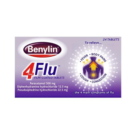 Benylin 4 Flu Film Coated Tablets are used to relieve nasal or sinus congestion with headache, fever and pain which are associated with the cold and flu. The medication contains 500mg of Paracetamol which reduces inflammation, relieves pain and fever. It also contains 22.5mg of pseudoephedrine hydrochloride, a decongestant, which clears the nasal passage. This medication also contains 12.5mg diphenhydramine hydrochloride which helps relieve coughing and sneezing.