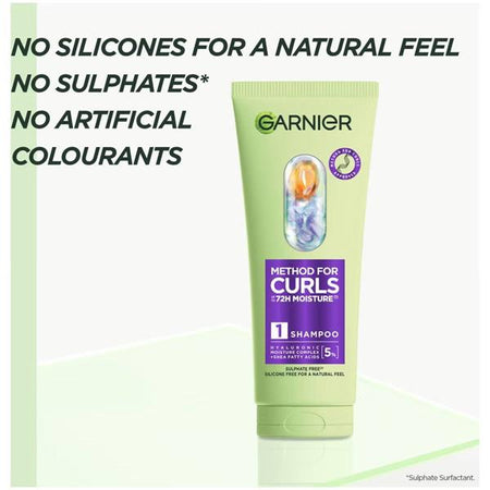 Discover the Garnier Method For Curls Shampoo, expertly formulated to hydrate and define all curl types. Infused with a 5% Hyaluronic Acid Moisture Complex and nourishing shea fatty acids, this shampoo delivers lasting hydration for up to 72 hours.