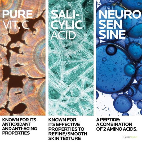 - Contains 12% vitamin C, hyaluronic acid, salicylic acid and neurosensine