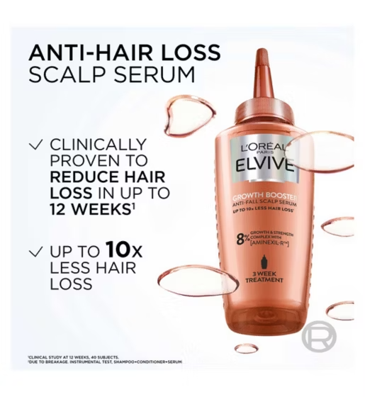 Hair thinning and loss can be influenced by stress, fatigue, hereditary factors, and external aggressors, leading to breakage and decreased density. L’Oréal Elvive Growth Booster Serum is a daily scalp treatment designed to anchor hair at the roots, reduce hair loss, and promote the growth process of existing hair for visibly denser, stronger strands.