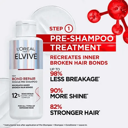 Experience the power of L'Oréal Bond Repair technology and bring your damaged hair back to life. Order the Elvive Bond Repair Pre-Shampoo Treatment today and start your journey to healthier, shinier, and stronger hair!