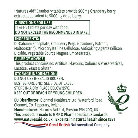 Natures Aid Cranberry contains 200mg of Cranberry. Cranberries support the body's natural defences and help maintain a healthy bladder and urinary tract.
