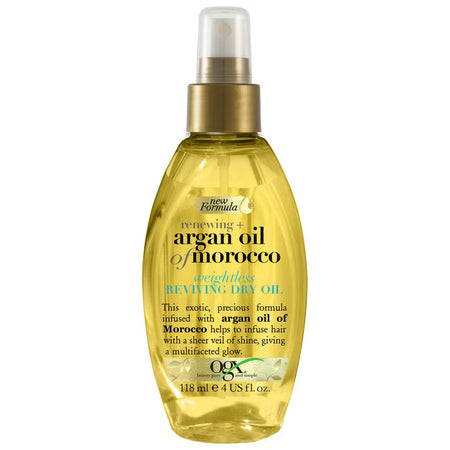 An exotic blend with Argan Oil helps to reduce the appearance of split ends and tame fly-away frizzies. Apply to damp towel dried hair before drying and spritz over dry hair for a light infusion of shimmer and shine. Find your hair happy, with the new OGX argan oil of Morocco dry reviving oil. Part of the new upgraded collection of hair treatments from OGX to add silky shine and strength for great hair days, every day. Help your hair to shine with this weightless reviving dry oil.