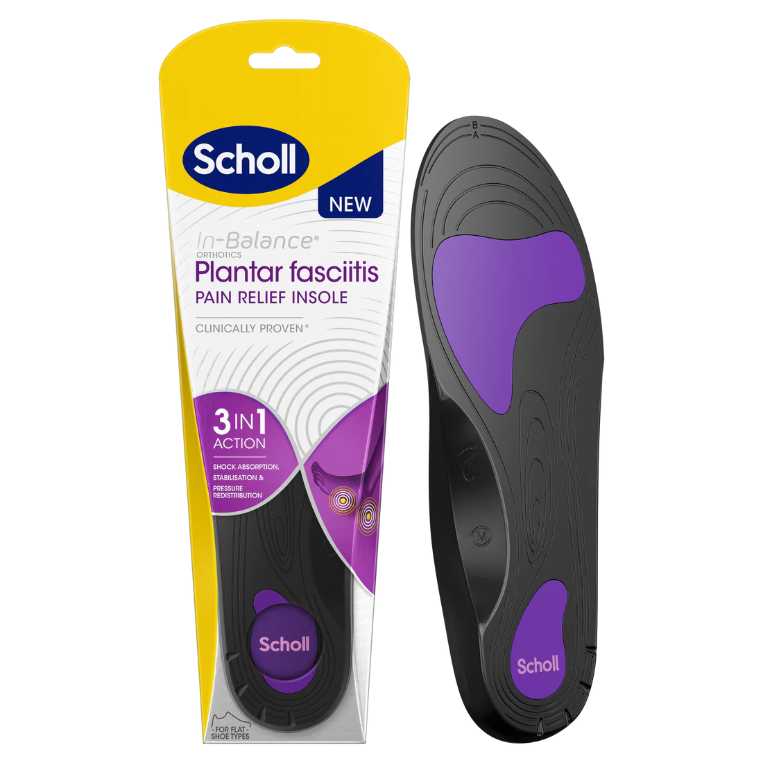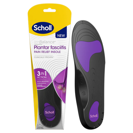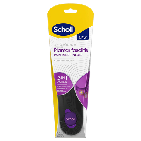 Scholl In-Balance® Orthotics Plantar Fasciitis Pain Relief Insoles are clinically proven to provide pressure relief to the base of the foot to help alleviate pain in the foot between the heel and the arch, known as plantar fasciitis. The insole has been specifically designed by biomechanics experts to provide a 3-in-1 action to help elevate the pain associated with plantar fasciitis.